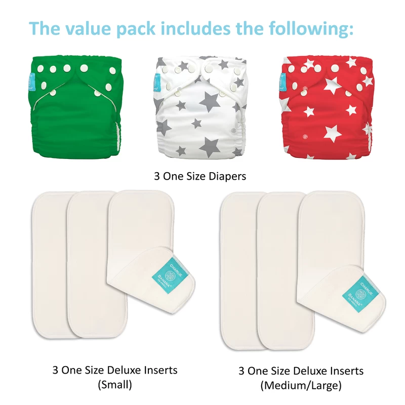What’s in the box – 3 One-Size reusable cloth diapers with fleece lining and 6 deluxe reusable inserts. (3 small size and 3 M/L size)