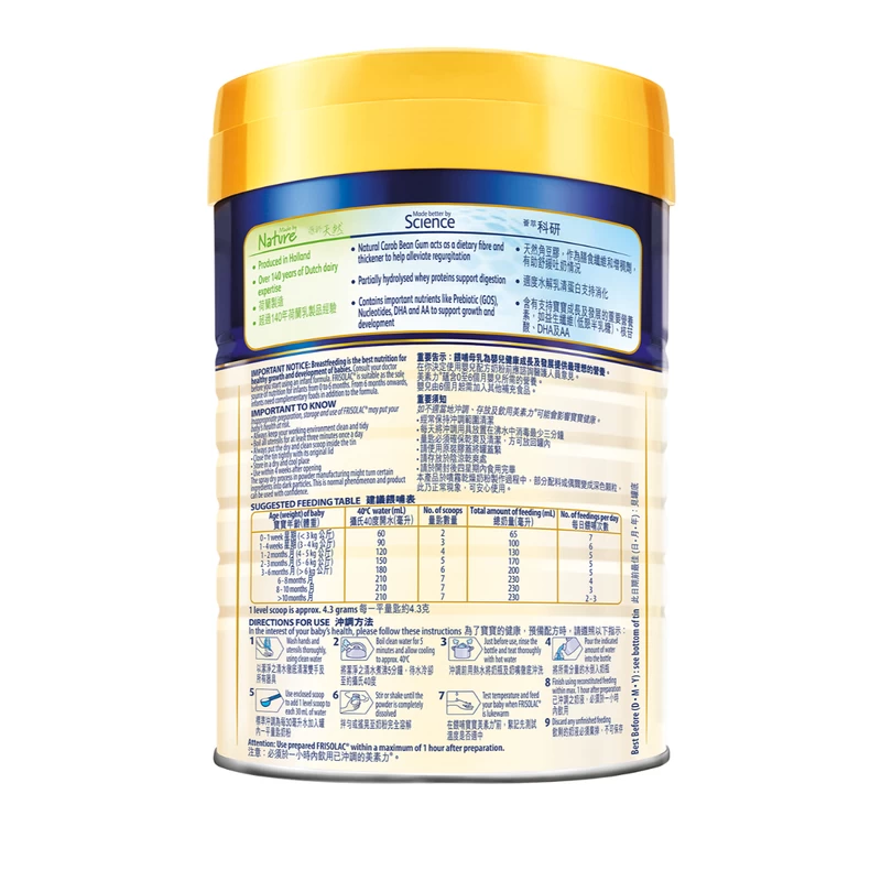FRISOLAC® Gold Comfort is a specially formulated infant formula with special medical purposes. It is suitable for dietary management of infants with regurgitation, hard stools and colic. It contains Natural Carob Bean Gum which acts as a dietary fibre and thickener, to help alleviate regurgitation. It also contains partially hydrolysed whey proteins, which support digestion.