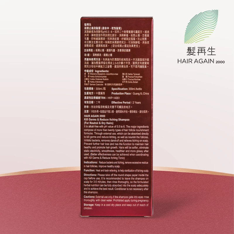Hair Again 2000 Kill Germs & Reduce Itching Shampoo is used to reduce bacteria and itching, which can prevent further hair loss and has the function to maintain hair healthy and promote hair growth. The shampoo contains special moisturizing ingredients which make hair soft, healthy and more glossy after use. (Better effectiveness can be achieved when apply with Hair Again 2000 Kill Germs & Reduce Itching Tonic ).