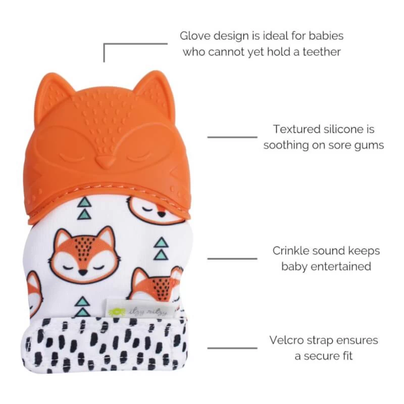 Sore gums are no match for the Itzy Ritzy teething mitt! Itzy Ritzy teething mitts are safe on babys gums and the glove design keeps baby from getting scratches on his or her face, and is also ideal for babies who cant yet hold a teether. Our teething mitts also include a crinkle sound to keep baby occupied! Our teething mitts are made of food grade silicone that is textured to help massage sore gums and provide relief to emerging teeth.