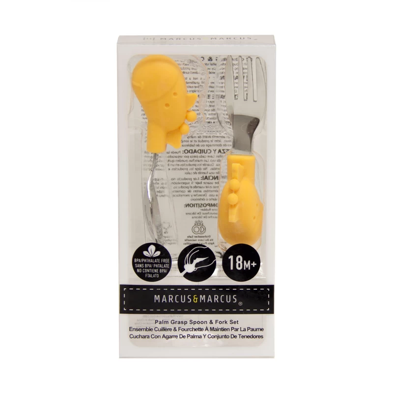 Marcus & Marcus Palm Grasp Spoon & Fork set was designed with little hands in mind. Parents found that their kids would get frustrated with the longer fork & spoon set and lose their appetite. We shortened our regular fork and spoon set and turn the handle 90 degrees so the utensils will fit more easily into a toddler’s palm grip. This makes self feeding easier and much more enjoyable for junior before they transition to our regular Kid’s fork & spoon set.