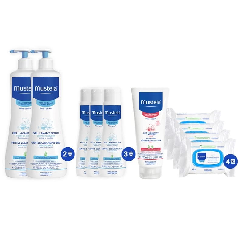 Mustela Gentle Cleansing Gel Set – Genlte Cleansing Gel 750ml x 2 Bottles + 200ml x 3 Bottles + Soothing Moisturising Lotion ( fragrance -free) 200ml + Cleansing Wipes 25pcs x 4 Packs